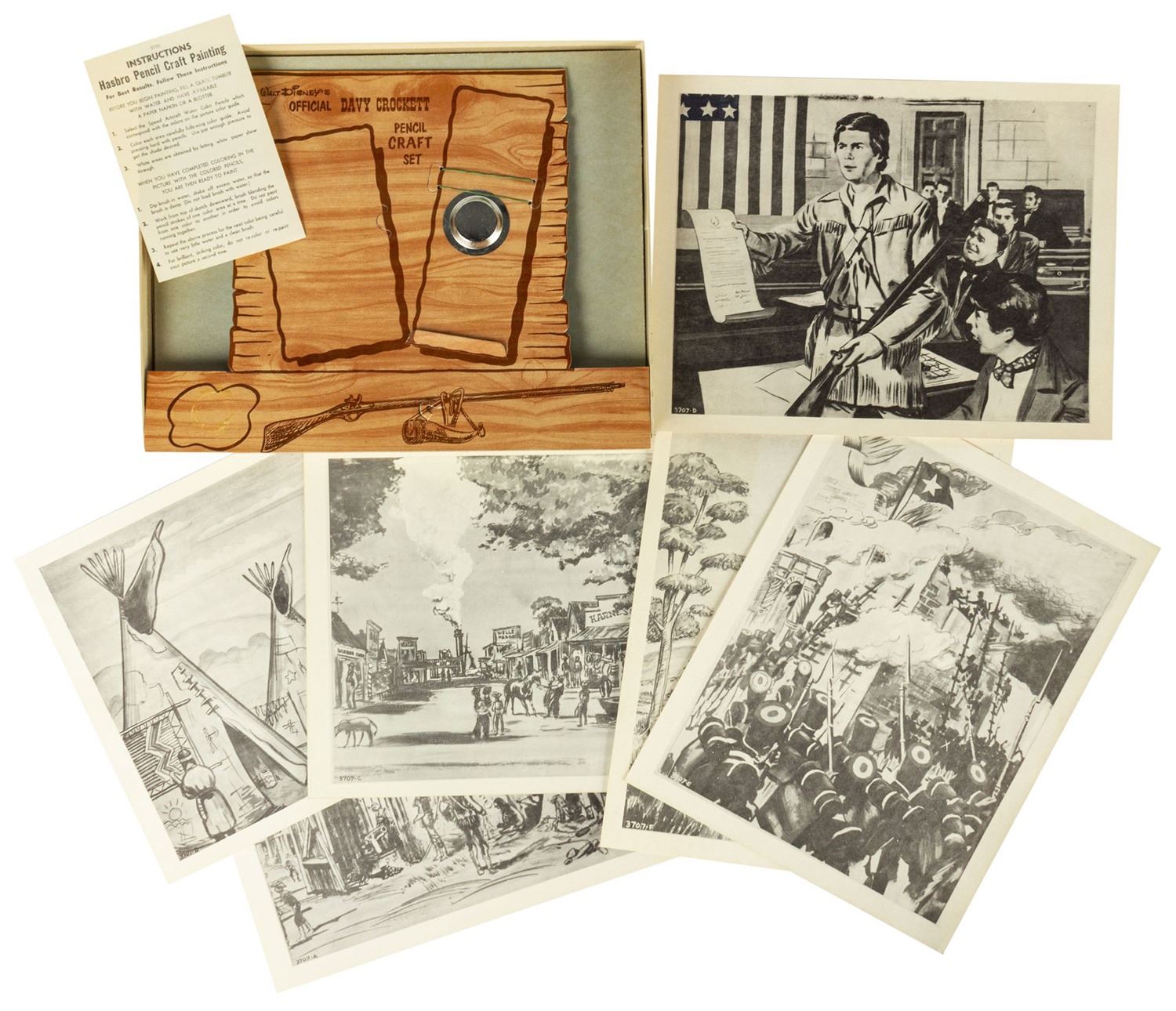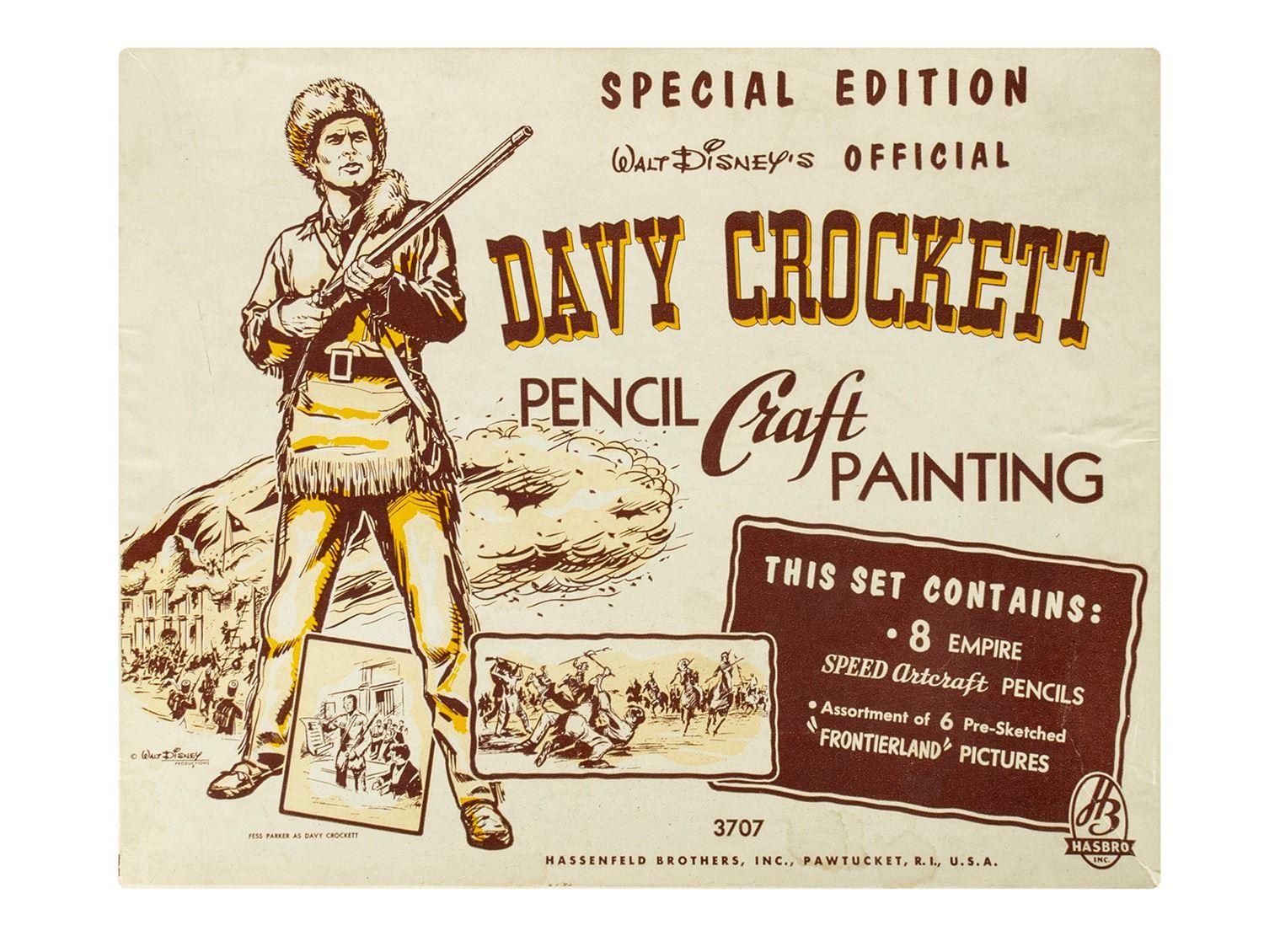 (Hasbro, c.1955) A special edition official Davy Crockett Pencil Craft Painting set in its original box. Contained within are (6) pre-sketched Frontierland pictures, a water dish, and a pencil holder. The pencils are not included. Measuring 11.25"x14.25" and 1.5" deep, the kit is in good condition with some edge-wear and warping to the lid.