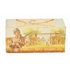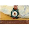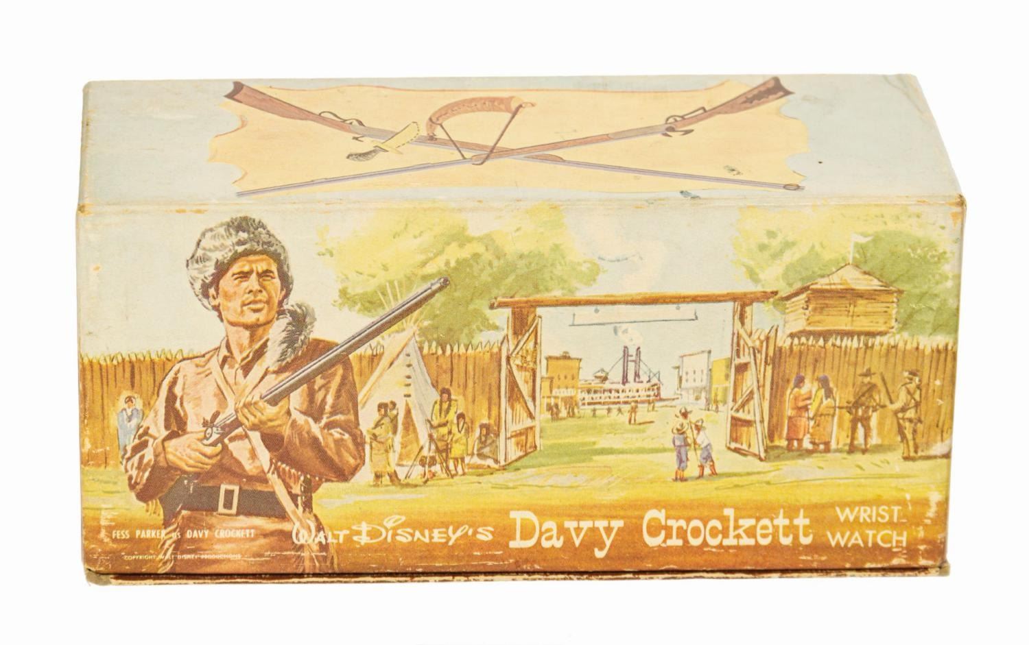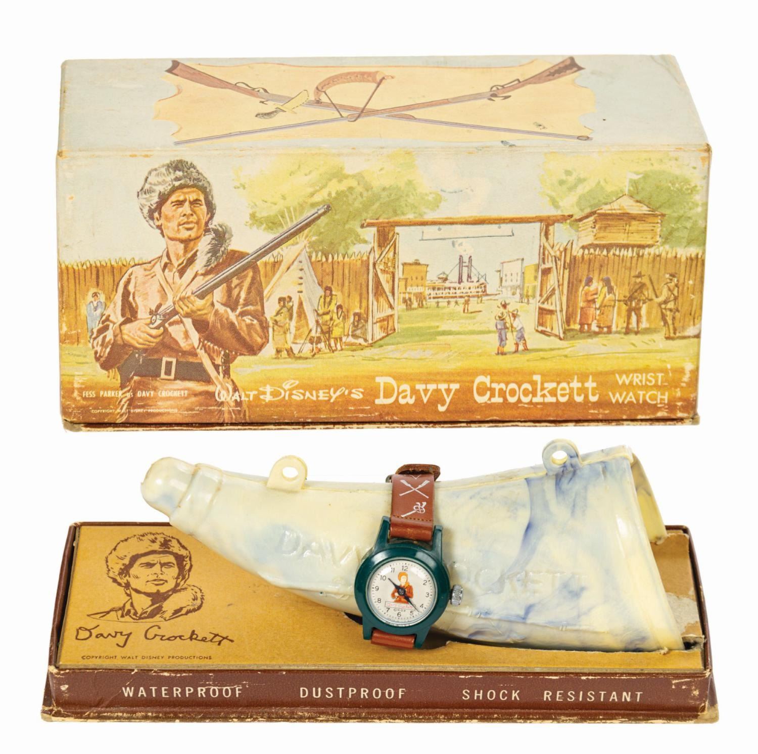(Disney, 1955) A vintage Davy Crockett wristwatch in a powder horn box. The watch case is constructed of metal and plastic. It must be manually wound and appears to keep time, though it has not been monitored over an extended period. The watch is presented in the original cardboard box packaging, wrapped around a blue and white marbled plastic powder horn with "Davy Crockett" molded into the side. The watch measures 1" in diameter by 7.5" long and the box is 3.75"x7.75" and 2.75" deep. The watch is in fine condition with some minor sealing wax residue to the band and the buckle. The powder horn has an extraneous piece of cellotape applied to the reverse, and the box exhibits some corner bumping, edge wear, and minor surface loss. There is a patch of surface loss to the interior tab that holds the powder horn in place.