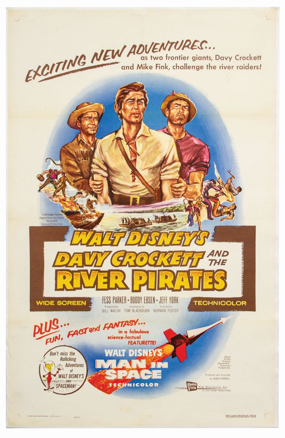 (Disney, 1956) A vintage U.S. one sheet poster for the Fess Parker adventure film, Davy Crockett and the River Pirates. Also billed with the feature is the animation and live action documentary short “Man in Space.” The poster has been linen-backed with minor retouching to the original folds. Measuring 41"x27", it presents in very good condition, exhibiting faint soiling to some blank background areas.