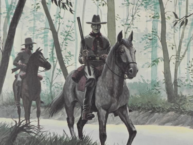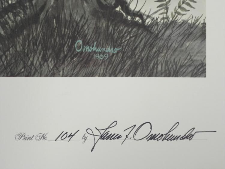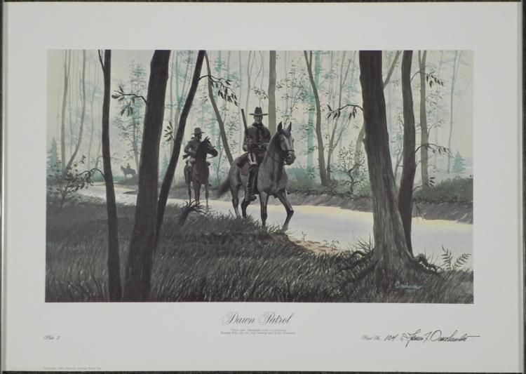 Dawn Patrol Juan J'omohundru Title: "Dawn Patrol"Artist: Juan J'omohundruPublished by American Heritage Prints, Inc Year Printed: 1969 Sheet size: 19 1/4" x 27" Signed by the artist in pen Numbered 104 (Plate II) Condition: Very Good