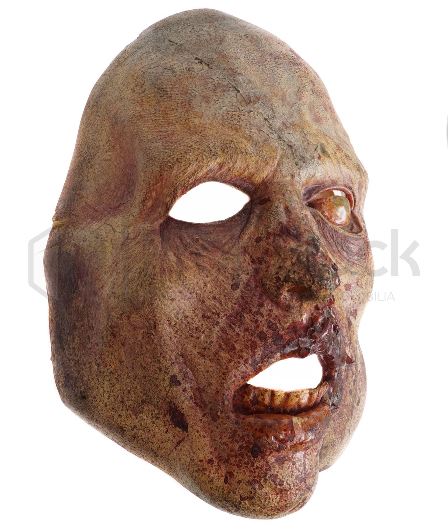 Zombie mask featured in the 2004 horror film remake Dawn of the Dead. A nurse, a policeman, a young married couple, a salesman and other survivors of a worldwide plague that is producing aggressive, flesh-eating zombies, take refuge in a mega Midwestern shopping mall. These style masks were worn by background actors throughout the film. Made of rubber, this "slip-mask" features the likeness of a zombie and has been realistically painted to resemble a decaying corpse. This item remains in excellent, production used condition.