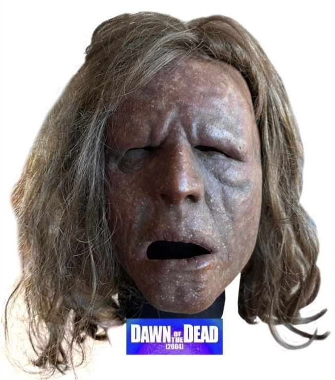 Original zombie mask used on the Zack Snyder directed action horror film 'Dawn of the Dead' (2004), which follows a group of survivors who take refuge in an upscale suburban shopping mall during a zombie apocalypse.