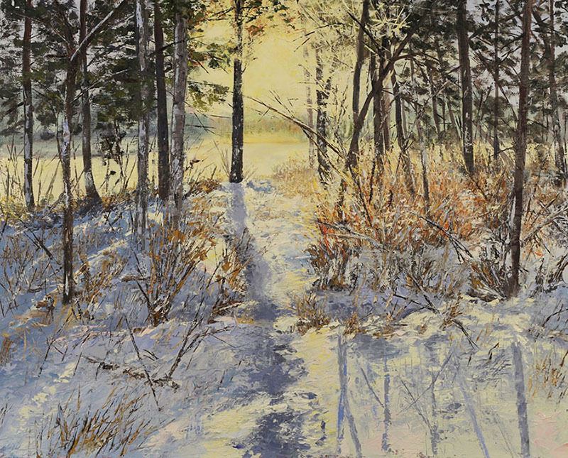 Artist: Elene Weege. Title: Dawn on the River. Size: 16" x 20". Medium: Oil (done with a palette knife). Description: It is an exciting winter morning for me as the rising sun illuminates the opposite bank of the river. Deep shadows are cast through the trees, tumbling and expanding down the hill. Only in Montana, unkempt and untouched.