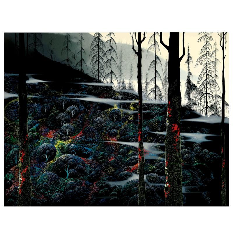 "Dawns First Light" is a limited edition serigraph on paper by Eyvind Earle (1916-2000). The piece is numbered, hand-signed by the artist, and accompanied by a certificate of authenticity. Measures approximately 25" x 32" (image).