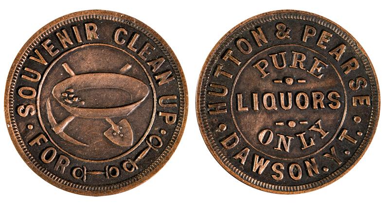 Obverse: Hutton & Pearse / Pure / Liquors / Only / Dawson, Y.T.; reverse: Souvenir Clean Up / For (two horses bits). Co, 30mm, R5. First example seen by FH in 35 years. Joseph M. Hutton and Frederick H. Pearse actively operated hotels and saloons in Dawson from the time of the gold rush until at least 1915 in the case of Pearse. The pair operated the Commercial Hotel and Saloon from 1902 until 1904, at which time it lost its liquor license. They then took over the Sideboard Saloon on 1st Avenue, next door to the Arcade Restaurant, which was located between 2nd & 3rd Streets.