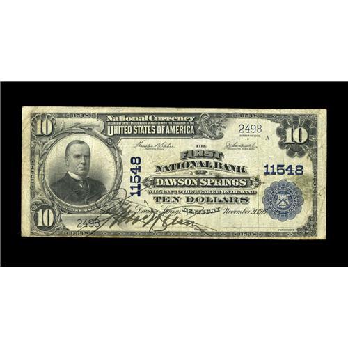 <B>Dawson Springs, KY</B></I> - $10 1902 Plain Back Fr. 632 <B>The First NB</B></I> Ch. # 11548<BR>A very scarce bank in large size, with the census standing at just four pieces. Of course, the Gale collection has fully half of the known large notes, including the finest. This piece grades <B>Fine,</B></I> with a split at the right margin.