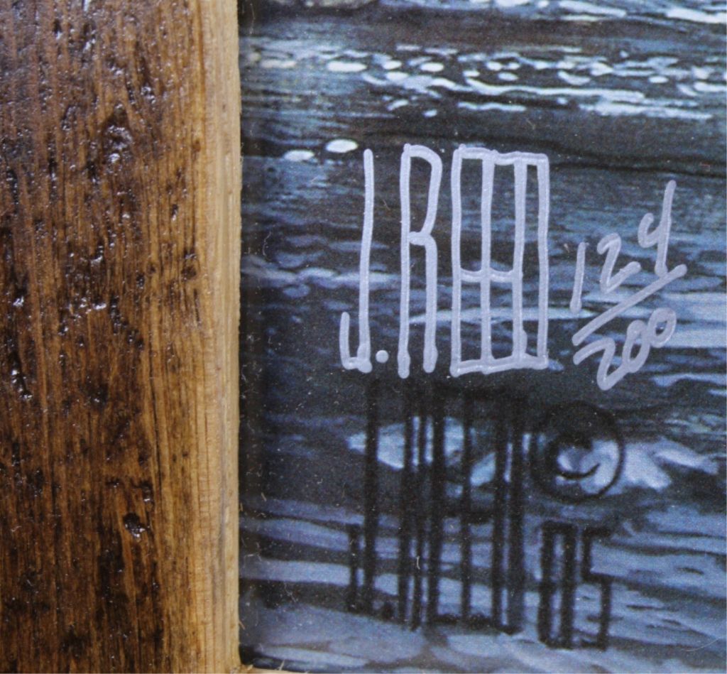 This is a limited edition work of art hand signed an numbered by the artist James Reed. The artist writes as follows about this painting. "In September of 2004, while driving along the Gibbons River in Yellowstone National Par, I was distracted by the colors in the canyon. The evening sun lit the upper portion of the canyon walls and the rest sat in shadow. The canyon floor along the river was alive with fall colors-I knew I had to paint it." This piece was done in 2005 and is numbered 124/200 hand signed prints. This is framed in the 1904 Fir Wood Floor from the Old Faithful Inn in Yellowstone National Park with the certificate of Authenticity on the back. Think of the history behind this wood. In the past 100 years, people from every walk of life and country in the world have stood on these floors, even including 6 United States Presidents. The frame is made by a Emigrant, Montana man and the wood is highly collectible. The frame measures 15.75"x35" and the artwork is