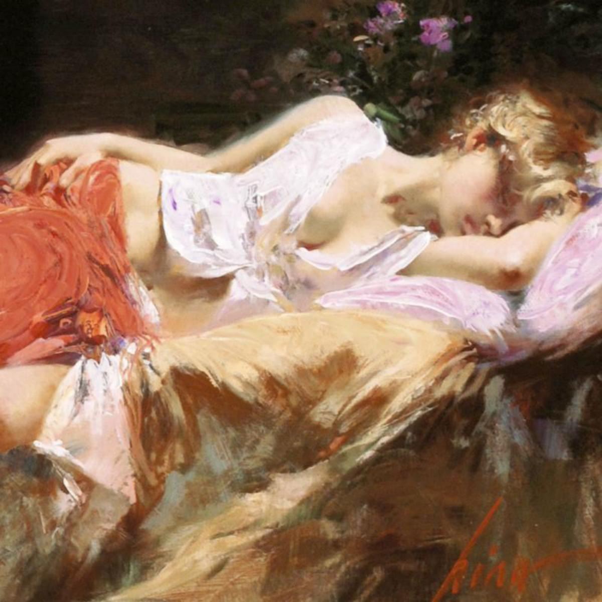 Pino's portraits allow glimpses into intensely personal, intimate spaces, conveying emotion through rich, warm color and sensual brushwork. "Day Dream" is a limited edition giclee on canvas that has been hand-embellished by Pino himself, AP numbered and hand signed by Pino (1939-2010). Includes Certificate of Authenticity! Measures approx. 12" x 10" (image). Reference #: 166050.