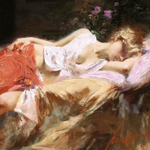 Pino's portraits allow glimpses into intensely personal, intimate spaces, conveying emotion through rich, warm color and sensual brushwork. "Day Dream" is a limited edition giclee on canvas that has been hand-embellished by Pino himself, AP numbered and hand signed by Pino (1939-2010). Includes Certificate of Authenticity! Measures approx. 12" x 10" (image).