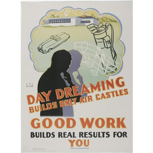 <B>"Day Dreaming Builds Only Air Castles" Propaganda Poster.</B></I> Chet Miller gently reminds us, that dreaming is not enough -- it must be followed up with real work! This poster has an approximate overall size of 20" x 27", and is in Excellent condition.<BR><BR><b>Shipping:</b> Flat Material, Large (<a target="_blank" href="http://www.heritageauctions.com/common/shipping.php">view shipping information</a>)