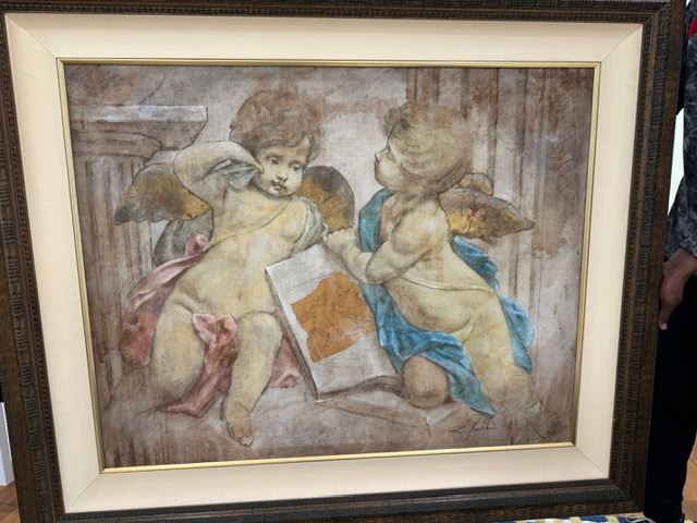 Richard Franklin borrowed a page from Renaissance Italy w/ two cherubs in a classic pose. A mixed-media on signed canvas it measures 43x34 Unframed, 57x48 framed. COA