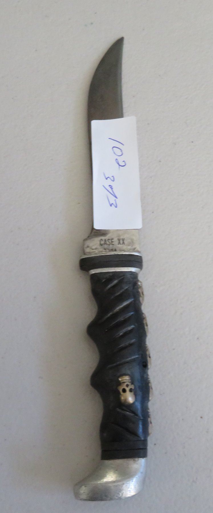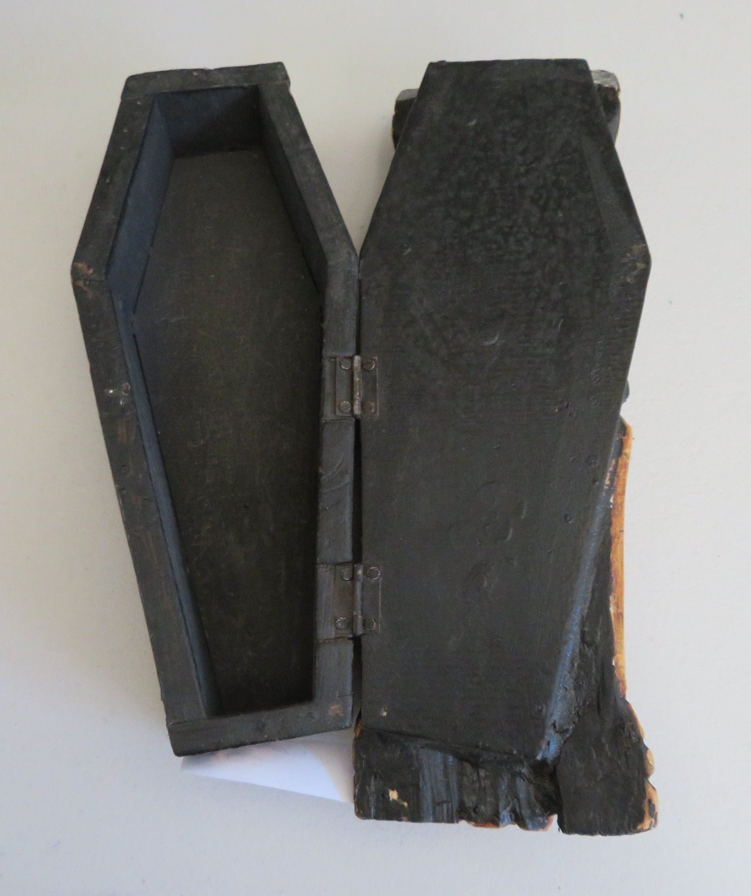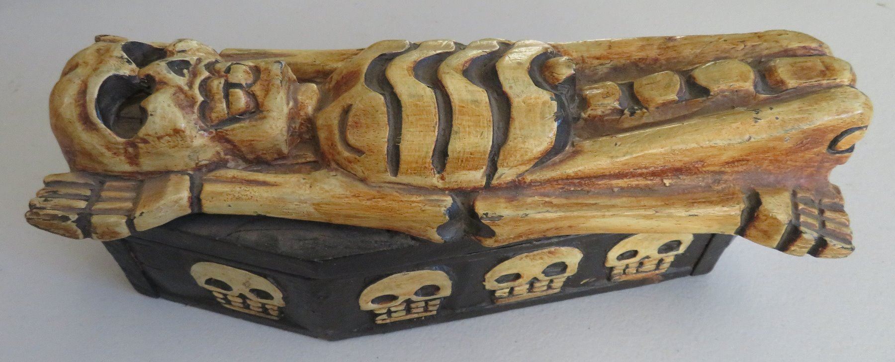 Day of the Dead Collection, c. 1940s. Made of wood, steel, leather and resin, the coffin measures 13" x 4" x 5". USA & Mexico. Skull measures 6" x 5" x 5", Case XX Knife measures 10 1/2" long. Condition: Good, see images. Shipping: $32.50 w/insurance and signature.