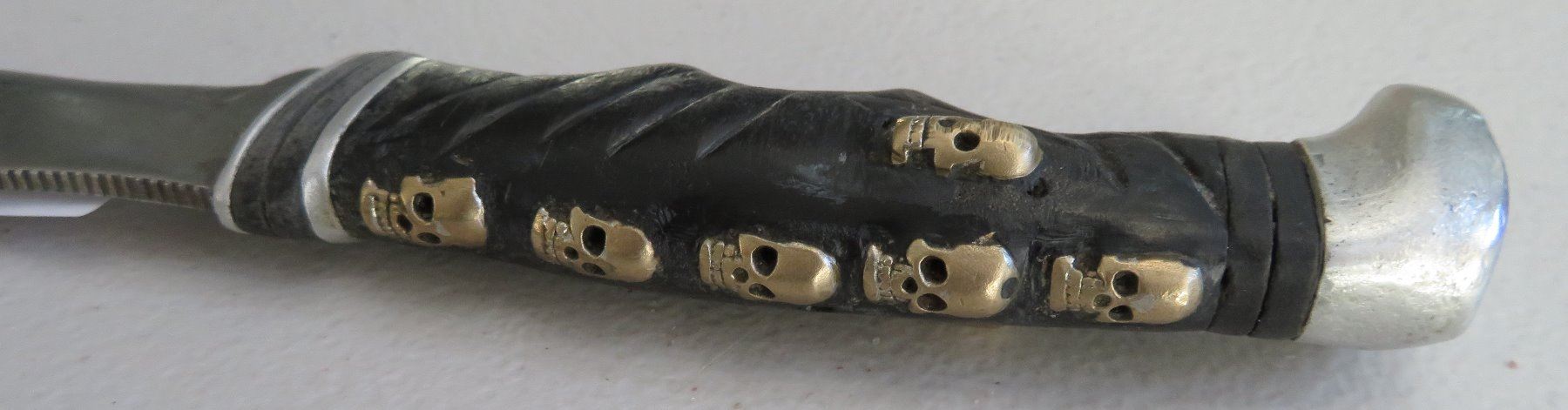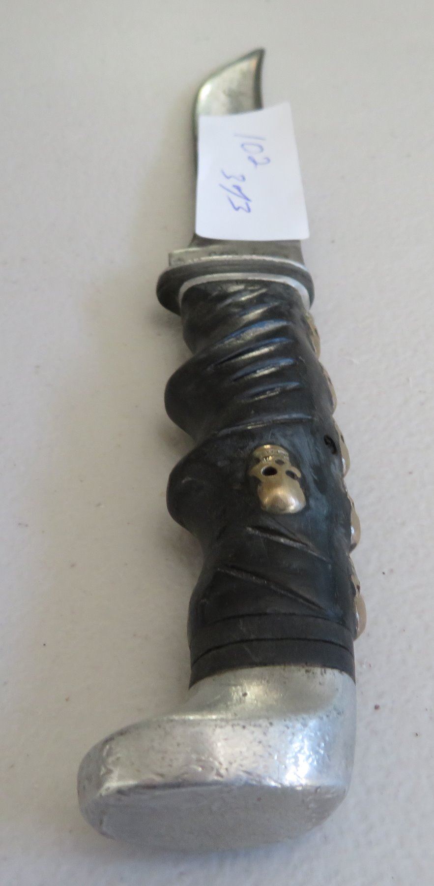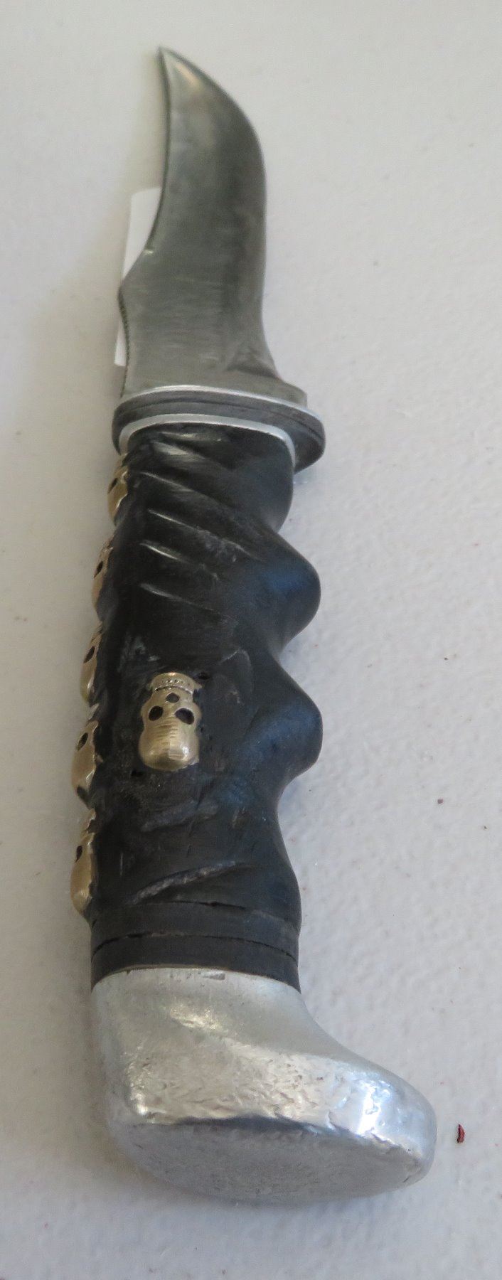 Day of the Dead Collection, c. 1940s. Made of wood, steel, leather and resin, the coffin measures 13" x 4" x 5". USA & Mexico. Skull measures 6" x 5" x 5", Case XX Knife measures 10 1/2" long. Condition: Good, see images. Shipping: $32.50 w/insurance and signature.