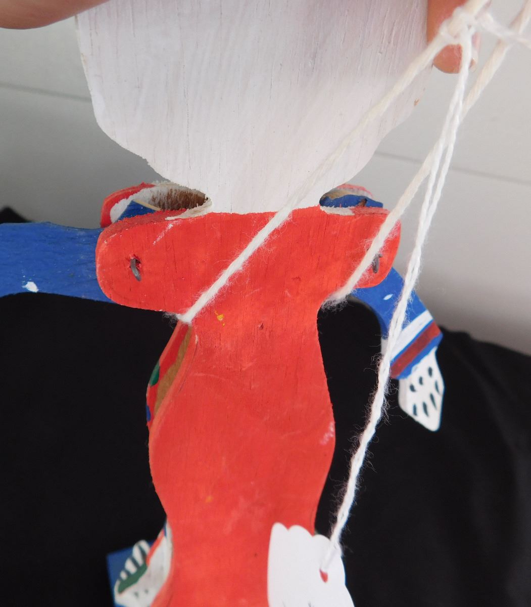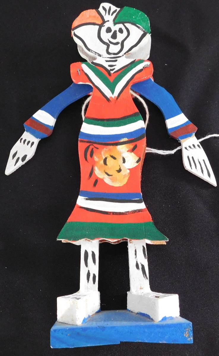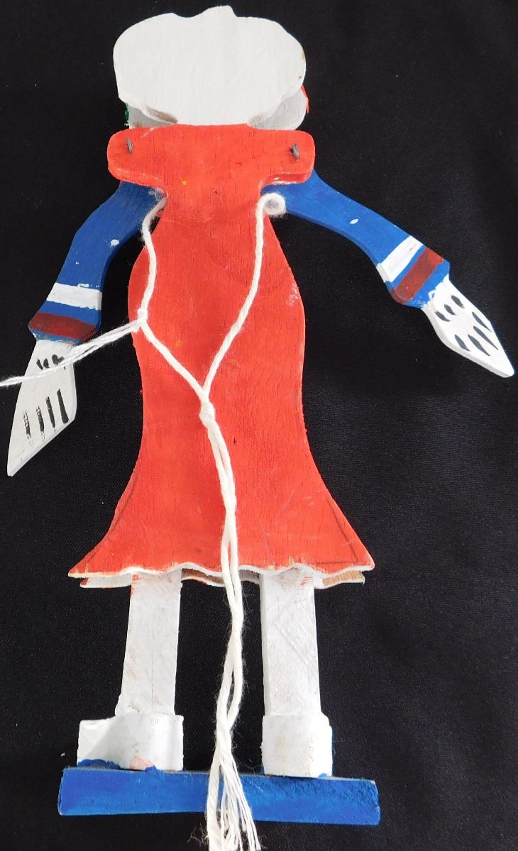 Day of the Dead Doll or Puppet, circa 1960. Made of wood, paint, wire and string. Item measures 10" x 3" x 3", Mexican. Arms rise when string is pulled up in back, polychrome painted. Condition: Good, see images. Shipping: $15.