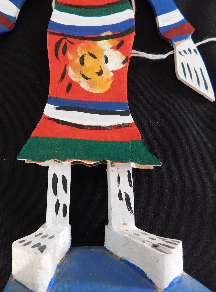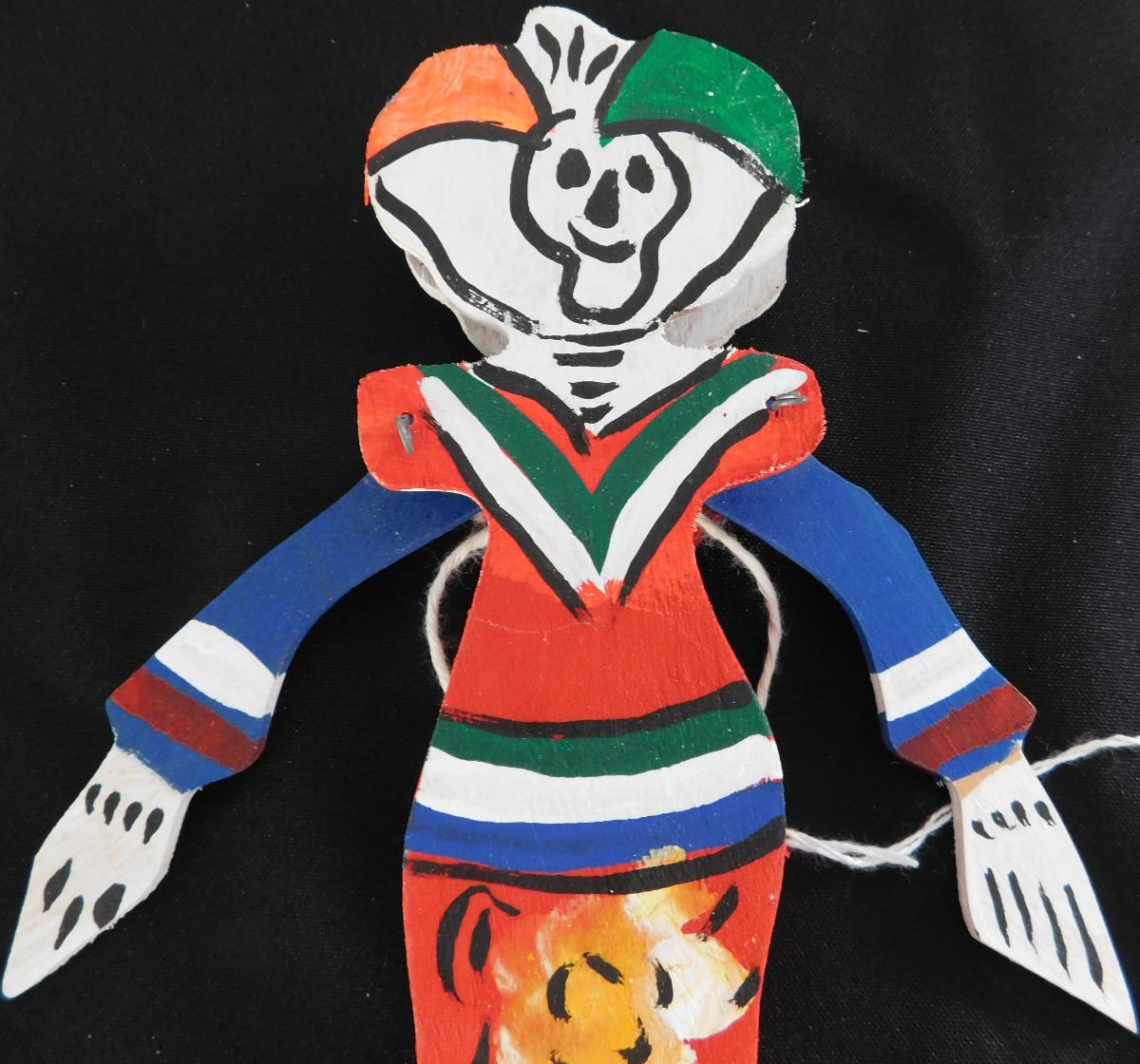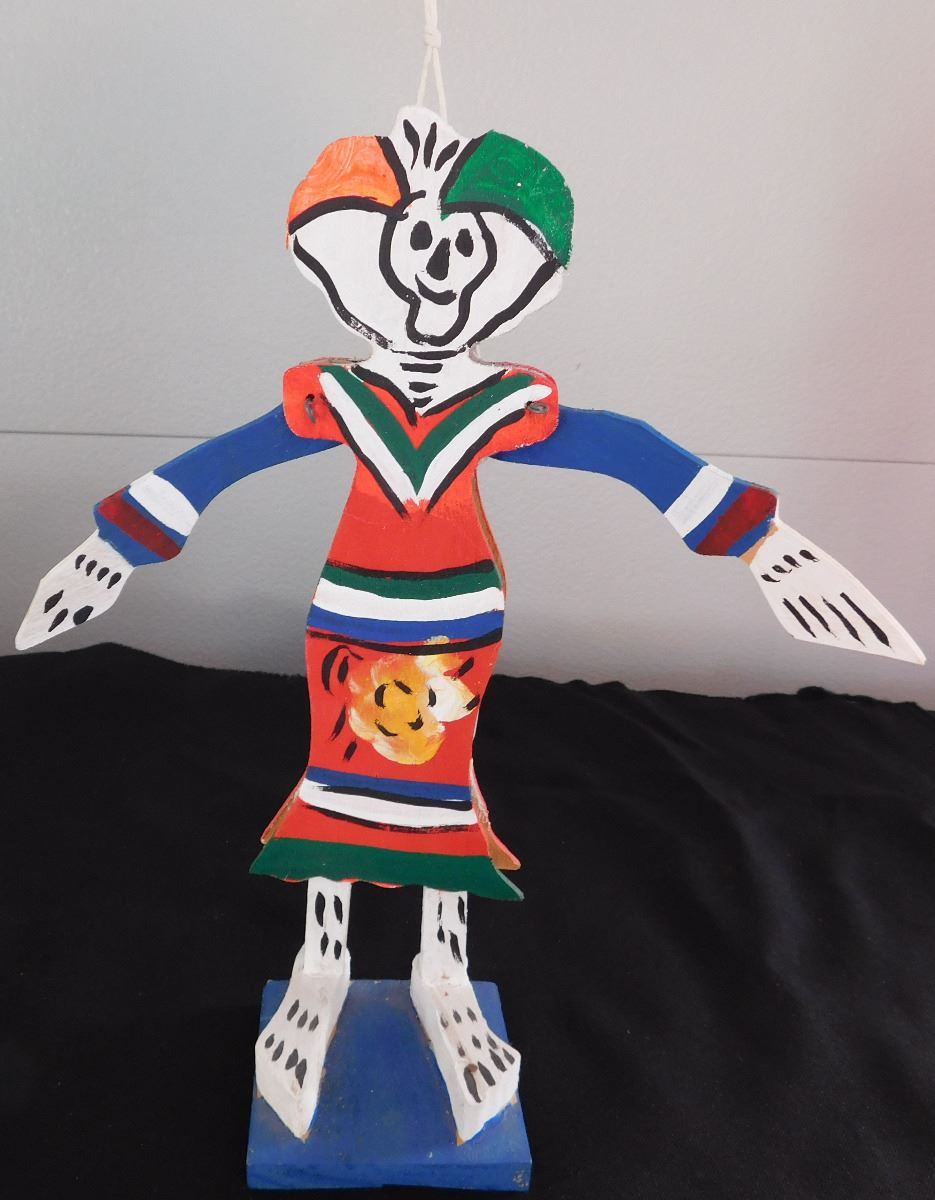 Day of the Dead Doll or Puppet, circa 1960. Made of wood, paint, wire and string. Item measures 10" x 3" x 3", Mexican. Arms rise when string is pulled up in back, polychrome painted. Condition: Good, see images. Shipping: $15.