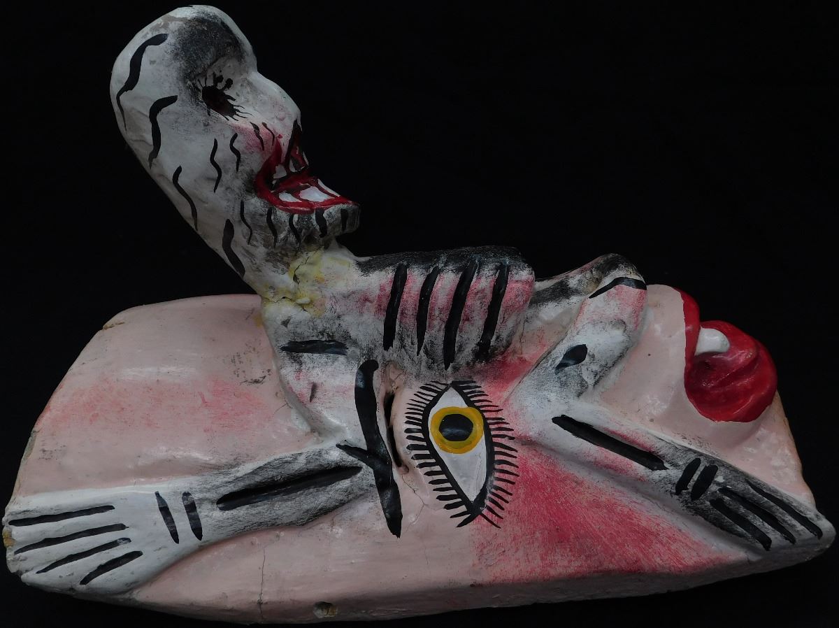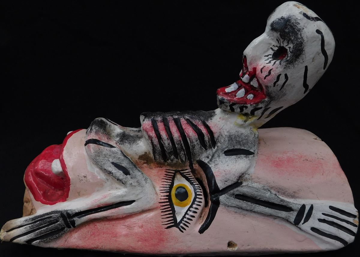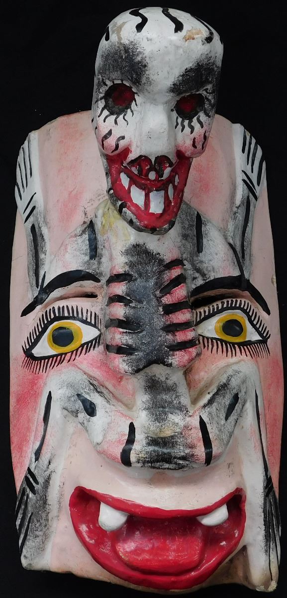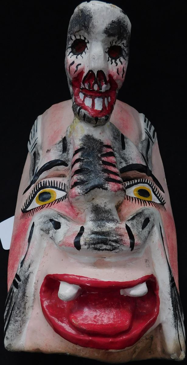 Day of the Dead mask, circa 1930. Made of wood, paint and metal wire for hanging. Item measures 12.5" x 8" x 9". Mexican, probably from Guerrero. Haunting effect of skeleton on woman's face. Condition: Minor nicks, some paint loss, see images. Shipping: $22.00.