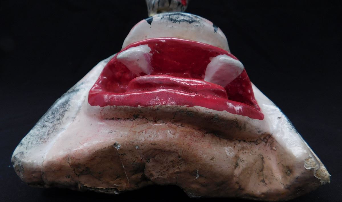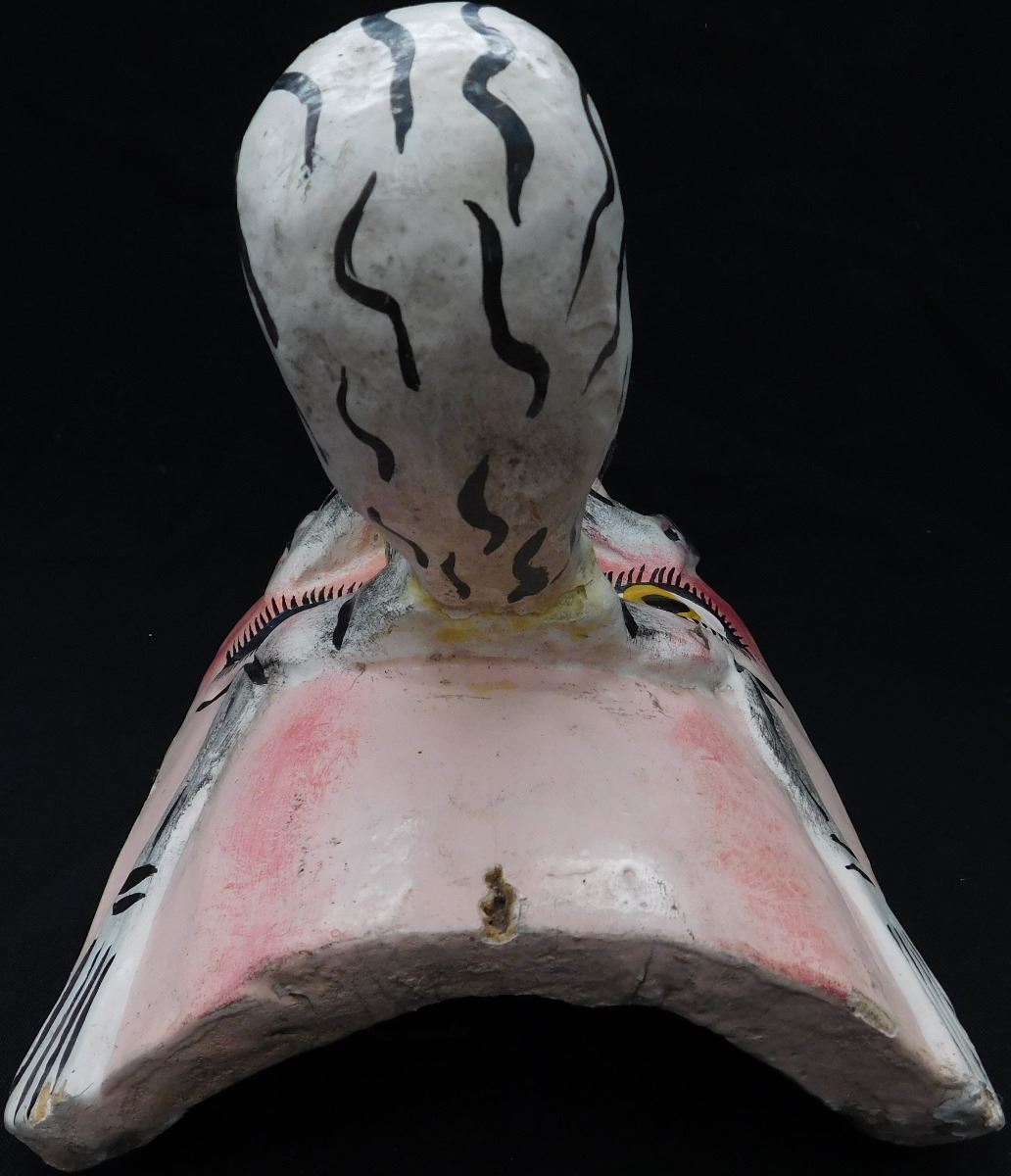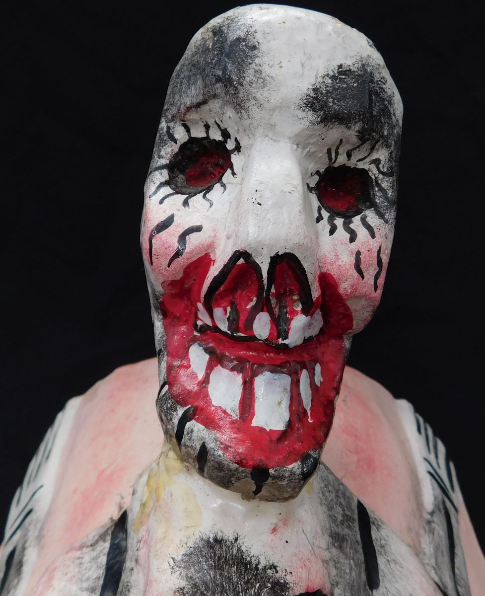 Day of the Dead mask, circa 1930. Made of wood, paint and metal wire for hanging. Item measures 12.5" x 8" x 9". Mexican, probably from Guerrero. Haunting effect of skeleton on woman's face. Condition: Minor nicks, some paint loss, see images. Shipping: $22.00.