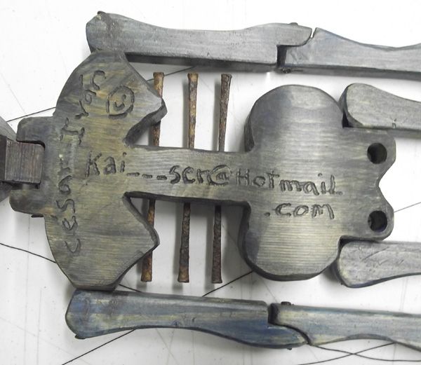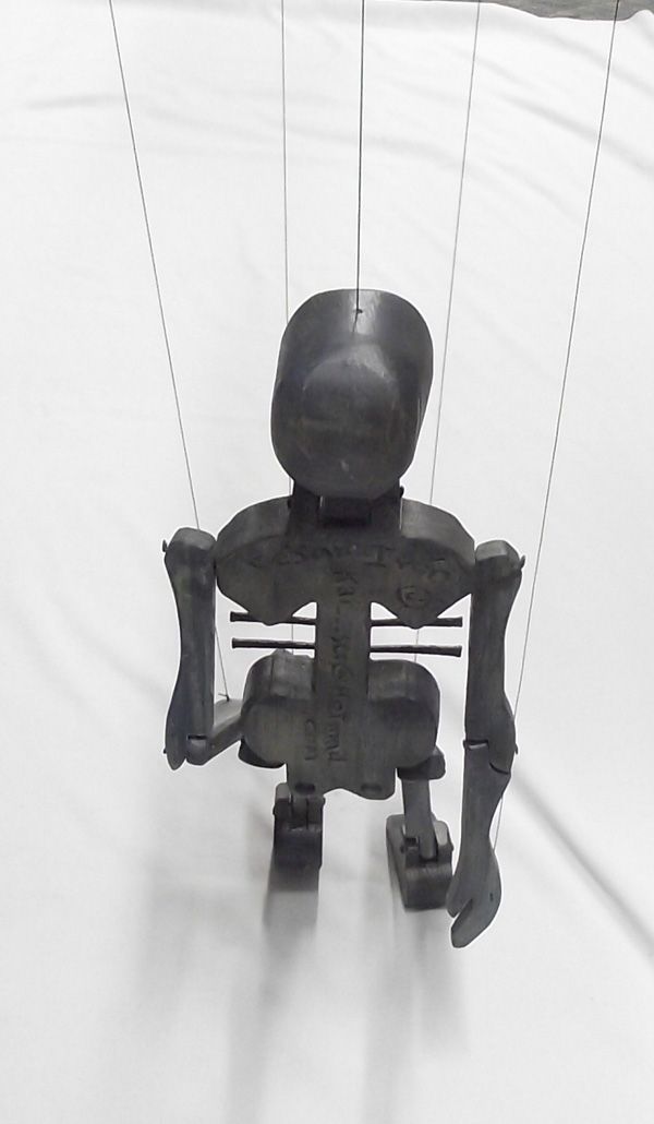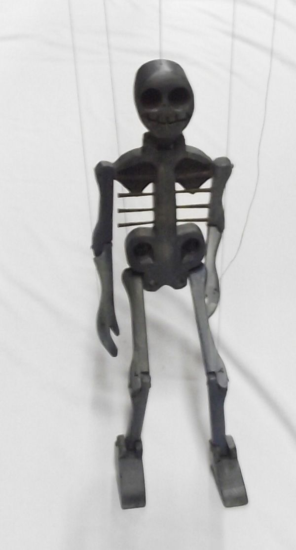 Day of the Dead Wood Marionette, Signed. Impressive piece of collectible Day of the Dead collectible. The artist has used hand-wrought nails for the ribs. Signed by artist, Cesar Ivan, Texas. Measures 23'' high x 7'' width.