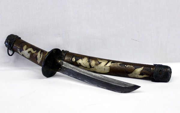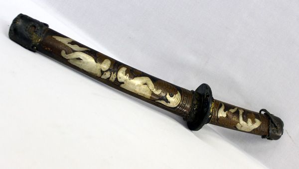 Day of the Rat Chinese Copper Handle Dagger. Dagger is in a Copper Silver Inlay Case, that measures 16.25'' L. Blade of dagger is approx. 7.25''L x 1''W.