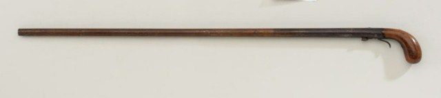 Day’s patent style percussion under hammer cane gun, circa mid 19th century in good condition with wood grip. The cane measures 35-1/2” overall, barrel portion approx 30-1/2” and approx. 52 cal smooth bore. Themetal portions show appox. 30-50% painted finish to resemble wood. The metal shows some light pitting and erosion. There is a stamp “W” or “M” near the rear portion and probably a maker’s mark with British proofs. The grip portion is good and shows a couple small losses where wood meets metal. The action works well and good condition overall. From an old New York collector’s estate. Est.; $500-$1,000.
