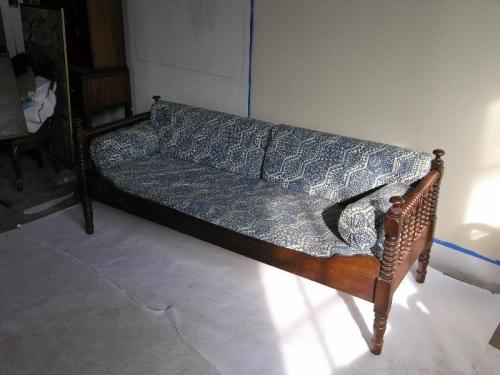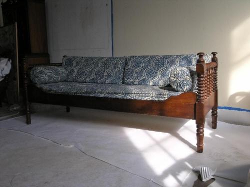 Antique Colonial style walnut rail and mattress, 30" by 29" by 7' 5"