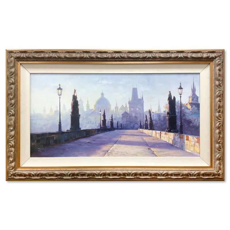 "Daybreak - Charles Bridge" is a limited edition giclee on canvas by Yuri Obuhovskiy, numbered 16/195 and hand signed. This piece comes framed. Includes Letter of Authenticity. Measures approx. 31.5" x 50.5" (frame), 19.5" x 39.5" (image). There is some minor wear on the frame.