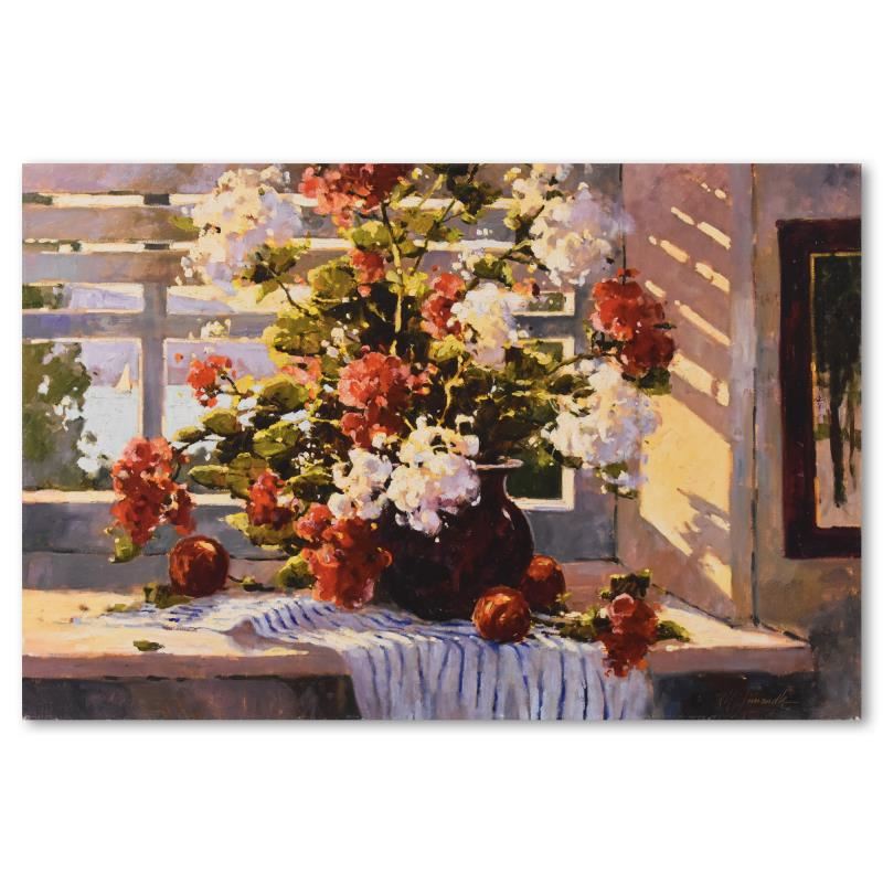 "Daybreak" is a hand embellished limited edition giclee on canvas by Marilyn Simandle, AP numbered 4/10 and hand signed by the artist. Includes Letter of Authenticity. Measures approx. 33" x 25" (image).