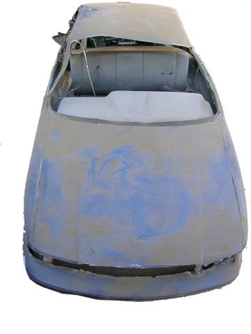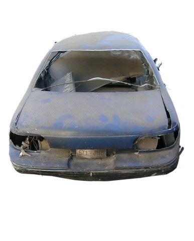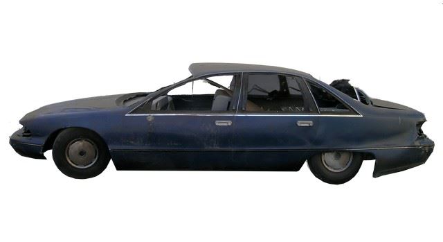 This is a blue distressed miniature car frame with wood frame, featured on screen in the special effects sequences taking place in the New Jersey tunnel in the fuel injected movie Daylight (1996). This miniature specifically was made for special effects and was created by the legendary Academy Award winning team of Grant McCune Design. Distressed blue fiberglass matting with wood frame, model car with tires and Washington license plate. (approx. 42" x 17")
