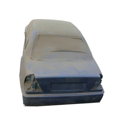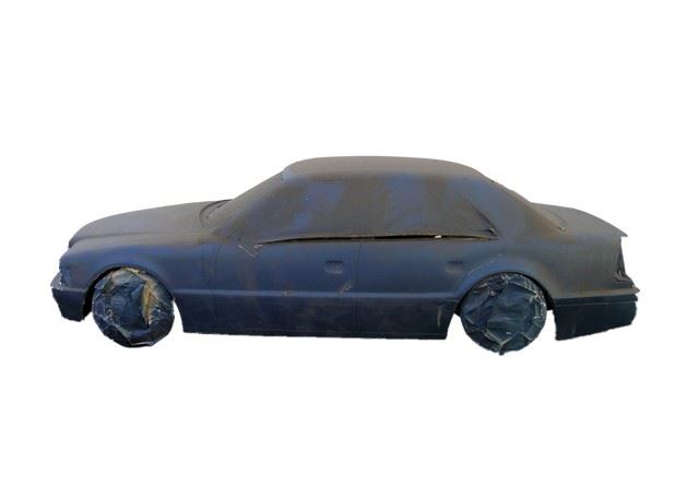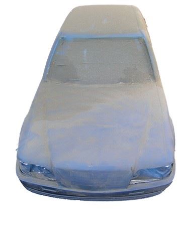 Created and featured on screen in the movie Daylight (1996) is this distressed blue miniature model car made out of plastic with wood frame, featured on screen from the fantastic New Jersey tunnel sequence in Daylight. This car was especially featured in the special effects sequences and was purposefully created with masking tape and is complete with tires. An incredible miniature created by the legendary team of Grant McCune Design. (approx. 43" x 15")