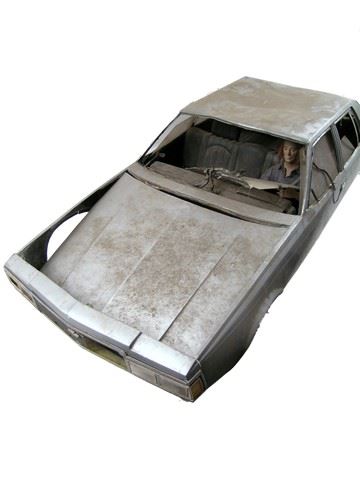This green fiberglass Chevy brand miniature car was screen used and made exclusively for the production of Daylight (1996). Used in many of the special effects sequences in the film taking place in the New Jersey tunnel, this miniature has a wood frame, model driver in the front seat without tires and with a special NASA sticker on the side. An incredible miniature created by the legendary team of Grant McCune Design (approx. 52" x 19")