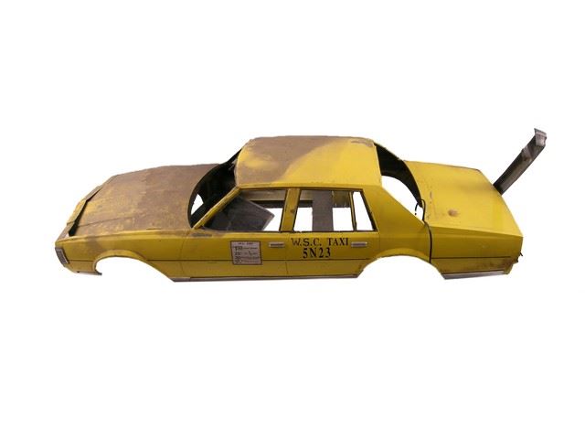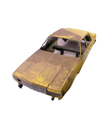 This is a green miniature car with wood frame, featured on screen in the special effects sequences taking place in the New Jersey tunnel in the fuel injected movie Daylight (1996). This miniature specifically was made without wheels for the production and features a Washington license plate. Created by the legendary team of Grant McCune Designs. (approx. 53" x 19")