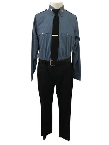 Daylight (1996) - Prison Bus Driver "Fink" screen worn New York Department of Prison police uniform. Costume includes a police hat, navy jacket, light blue shirt, navy with silver bar tie, and navy pants to match. Also includes a plain white undershirt. This uniform represents a key role in the film's dramatic opening sequence.