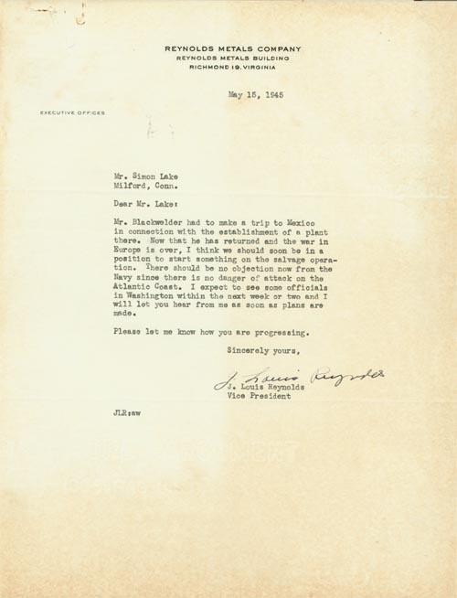 TLS. 1pp. 8 1/2" x 11". Richmond, Virginia. May 15, 1945. A typed letter signed "J. Louis Reynolds" as Vice President of the "Reynolds Metals Company". He wrote to the noted submarine inventor SIMON LAKE: "Mr. Blackwelder had to make a trip to Mexico in connection with the establishment of a plant there. Now that he has returned and the war in Europe is over, I think we should soon be in a position to start something on the salvage operation. There should be no objection now from the Navy since there is no danger of attack on the Atlantic Coast. I expect to see some officials in Washington within the next week or two and I will let you hear from me as soon as plans are made." The letter has light browning to the edges and is in fine condition; the original envelope is included.
