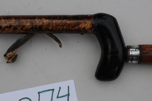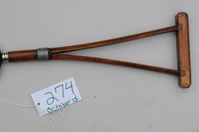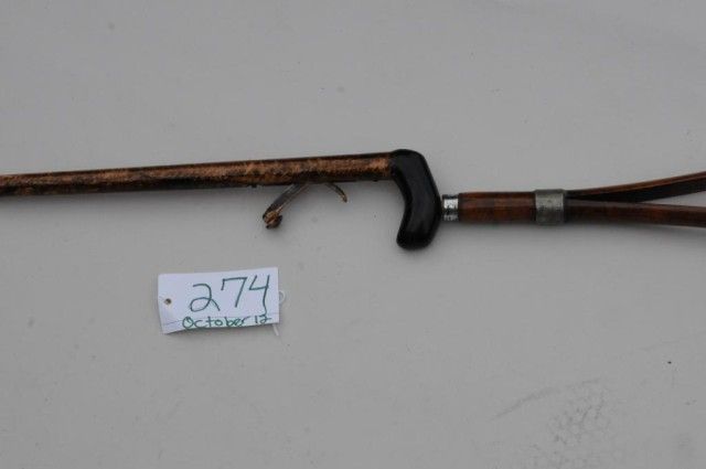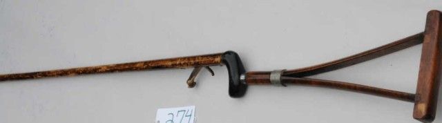Days Patent style under hammer percussion cane gun with detachable stock fashioned to appear like crutch from a distance. The metal portion of the cane shows a painted finish that resembles wood. The condition is verygood plus to near fine and we would date this oddity to 1850’s to 60’s. Est.; $2,500-$5,000