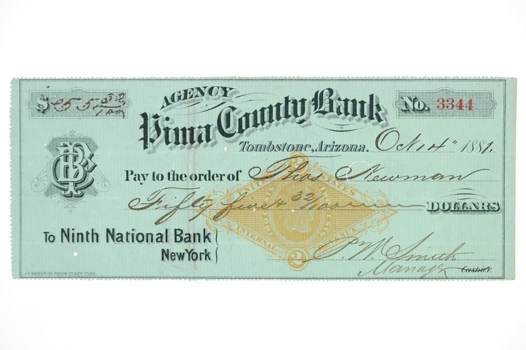 Featured in this lot is this 12 days prior to O.K. Corral Shootout cut from Pima County Bank check circa Oct. 14, 1881 and displayed in the Tombstone Western Heritage Museum; Provenance: From the Tombstone Western Heritage Museum in Tombstone, Arizona. The check is cut from the Agency of Pima County Bank paid to the order of Thomas Newman for $55.32 and signed by P.W. Smith. This check was cut 12 days before the shooting at the O.K. Corral on Oct. 26, 1881. The Gunfight at the O.K. Corral took place on October 26, 1881, in Tombstone, Arizona Territory, and remains one of the most famous shootouts of the American Old West. The confrontation involved lawmen Wyatt, Virgil, and Morgan Earp, along with Doc Holliday, facing off against members of the Cowboy faction, including Billy Clanton, Tom McLaury, and Frank McLaury. Though the actual gunfight lasted less than 30 seconds, it left three Cowboys dead and became a defining moment in the struggle between law and outlaw in the frontier mining town. The event cemented Tombstone’s place in Western legend and American history. The condition of this Pima County Bank Note is well preserved with no obvious signs of damage and shows a well preserved overall condition. The measurements of this bank note is 3 1/4" x 8". TTD-376