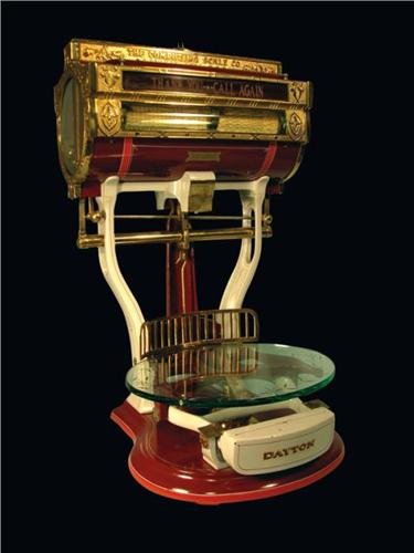 Dayton Computing Barrel Scale, style 146. Automatic compensating device with cut glass tray. Small paint chip on front of weight otherwise excellent restored condition.