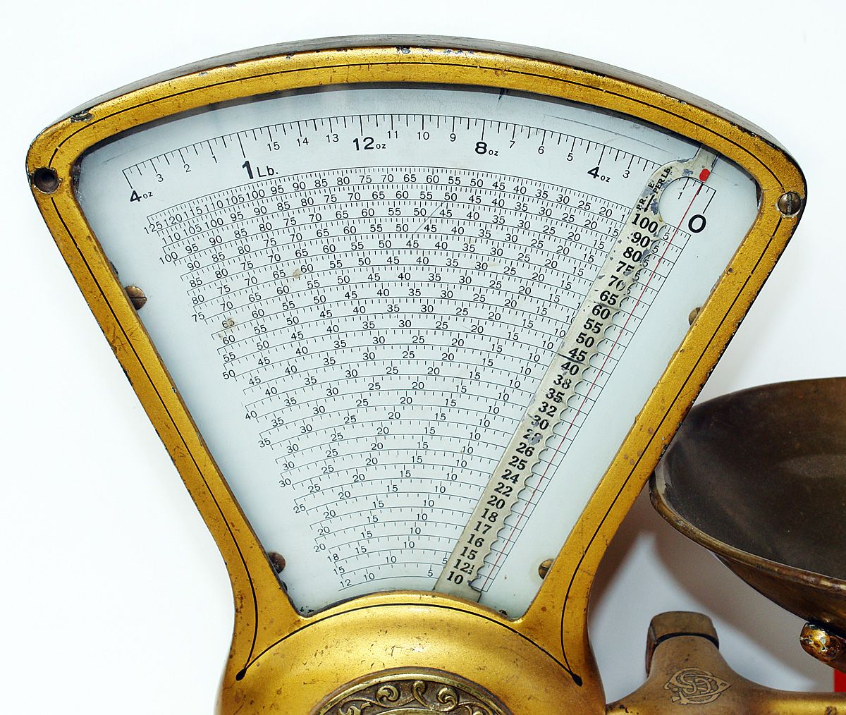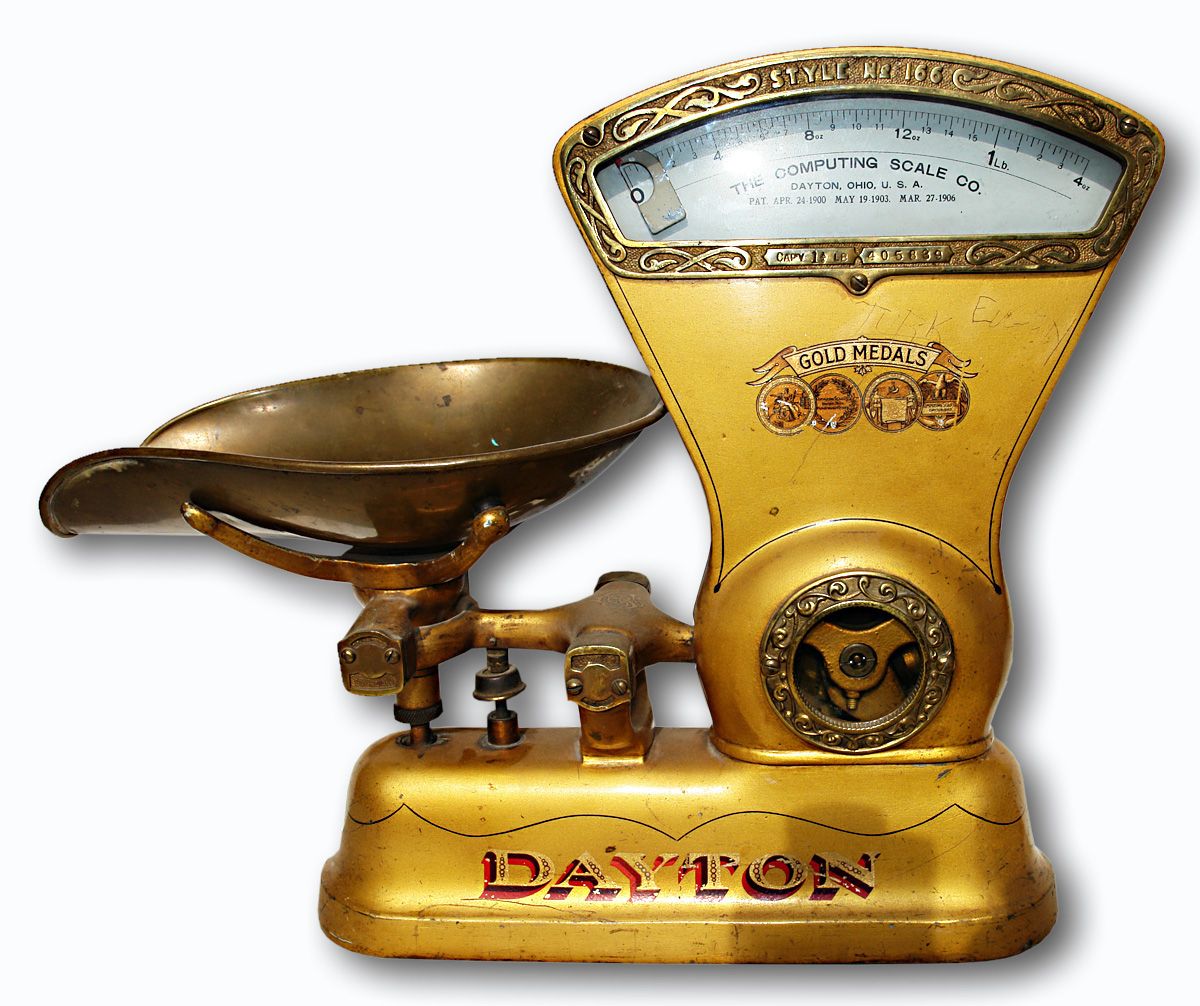 Dayton Gold Medal computing scale of Dayton OH. 14" tall, 18" wide, off-side of scale has a printed table to compute price per oz. Pat. Dated 1900, 1903, 1906, excellent condition.