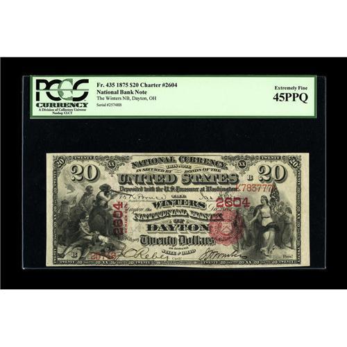 <B>Dayton, OH</B></I> - $20 1875 Fr. 435 <B>The Winters NB</B></I> Ch. # 2604<BR>A lovely Series 1875 $20 which easily appears to have merited it PCGS assigned grade of <B>Extremely Fine 45PPQ,</B></I> as it is unusually bright and appears fully new until very closely inspected. This is a very scarce and undervalued type in all grades, but especially so this nice.<BR><BR><b>Shipping:</b> Coin/Currency (<a target="_blank" href="http://www.heritageauctions.com/common/shipping.php">view shipping information</a>)