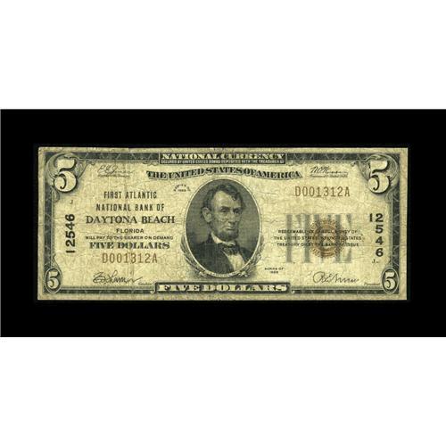 <B>Daytona Beach, FL</B></I> - $5 1929 Ty. 1 <B>First Atlantic NB</B></I> Ch. # 12546<BR>In 2004 we sold a Type 1 $20 in VF-XF on this bank for almost $2000. We don't expect this <B>Very Good</B></I> $5 to go that high, but we do know that it is only the fifth note on this bank to cross the auction block in the last 23 years.<BR><BR><b>Shipping:</b> Coin/Currency (<a target="_blank" href="http://www.heritageauctions.com/common/shipping.php">view shipping information</a>)