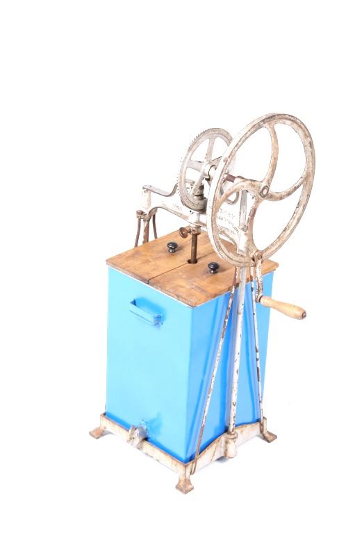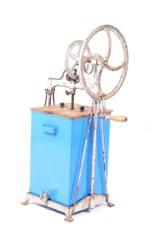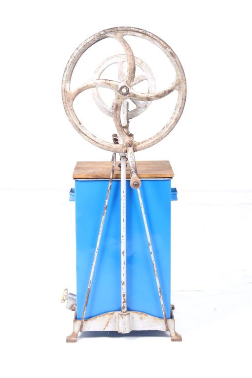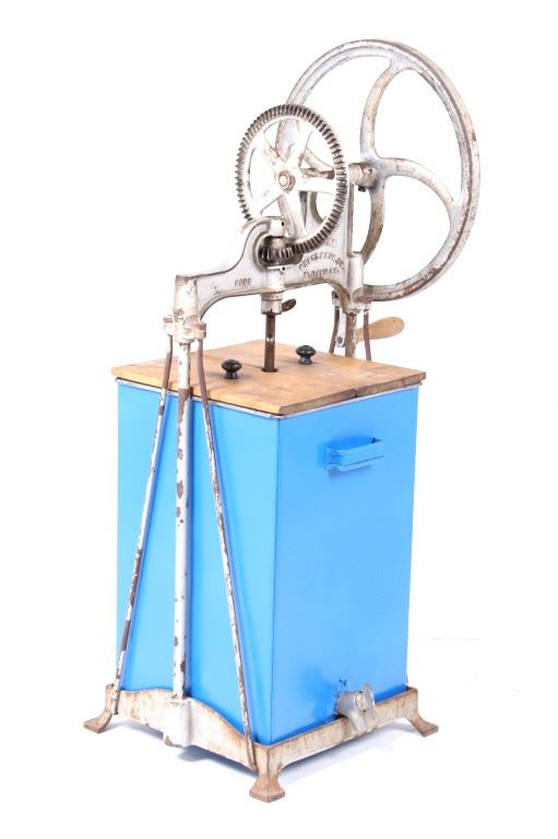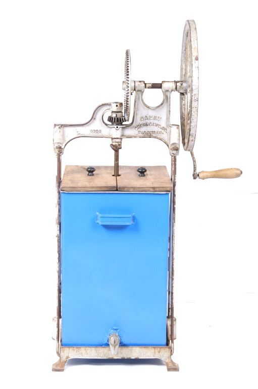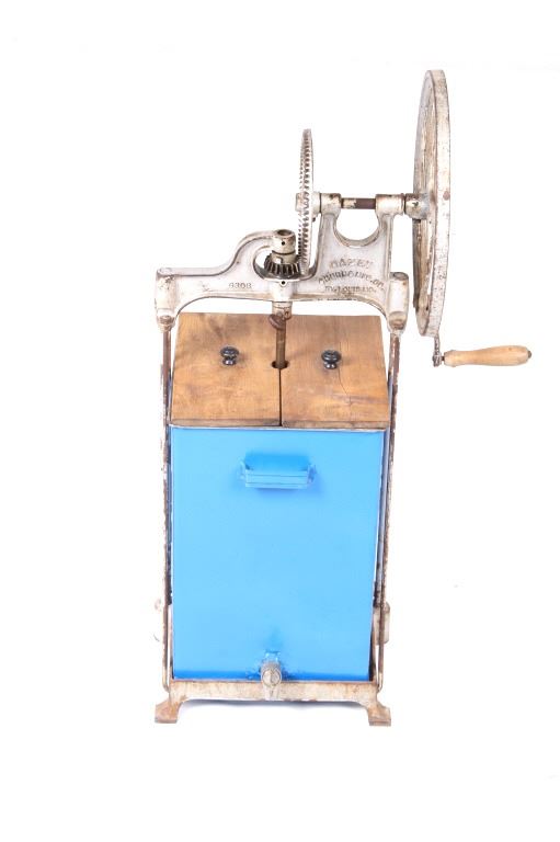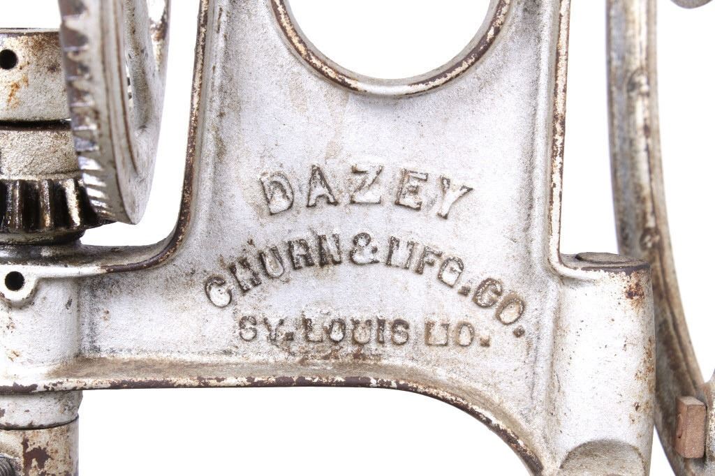Available for your bidding pleasure is this Dazey Churn Manufacturing Co Butter Churn. In the early 1900's, E.B. Jones developed a small glass churn for home use. Nathan Dazey purchased Jones' business and relocated it to St. Louis, Missouri as the Dazey Churn and Manufacturing Co. Dazey churns were manufactured up until 1945. Although best known for its butter churns, the company also made can openers, knife sharpeners and other kitchen products. This butter churn displays a metal construction with a metal crank, a wood top and a wooden agitator. This lot also includes a butter shaper. The hand crank operates by threading the crank to the top of the respective jar, and simply crank the hardwood handle to spin the wooden paddles inside. The crank is labeled with "Dazey Churn & Mfg. Co. St. Louis IL". This churn is in very good condition for age and measures 31" tall, 17" deep and 13" wide.