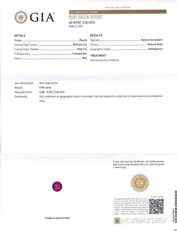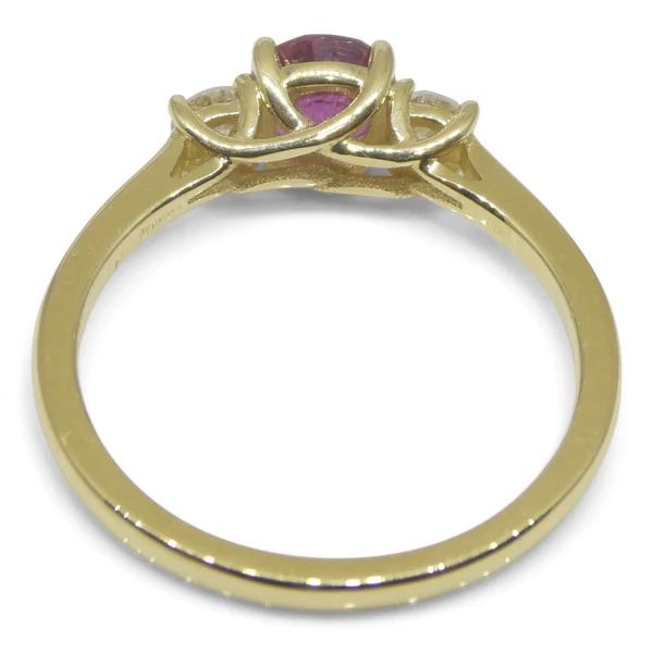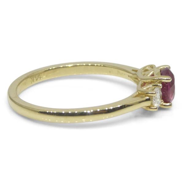 Majestic 0.96 Ct Red Ruby is a round brilliant cut measuring 5.48 - 5.55 x 3.66 mm. This stunning gem is set in 14k Yellow Gold accented with 2 diamond stones. The ring is currently a size 7, it can be resized for free after purchase. Total weight of item: 2.46 Ct. Origin: Madagascar. Treatment: None. Please see the certification for additional information.