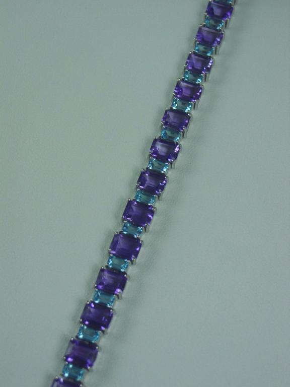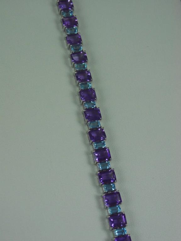 Dazzling 10 karat white gold heavy link ladies custom made bracelet set with 21 fine emerald cut Amethyst and sky blue topaz weighing approx. 25.00 carats. Retail $2,950.00 Estimate $1,000-$1,500 Very laborintensive.