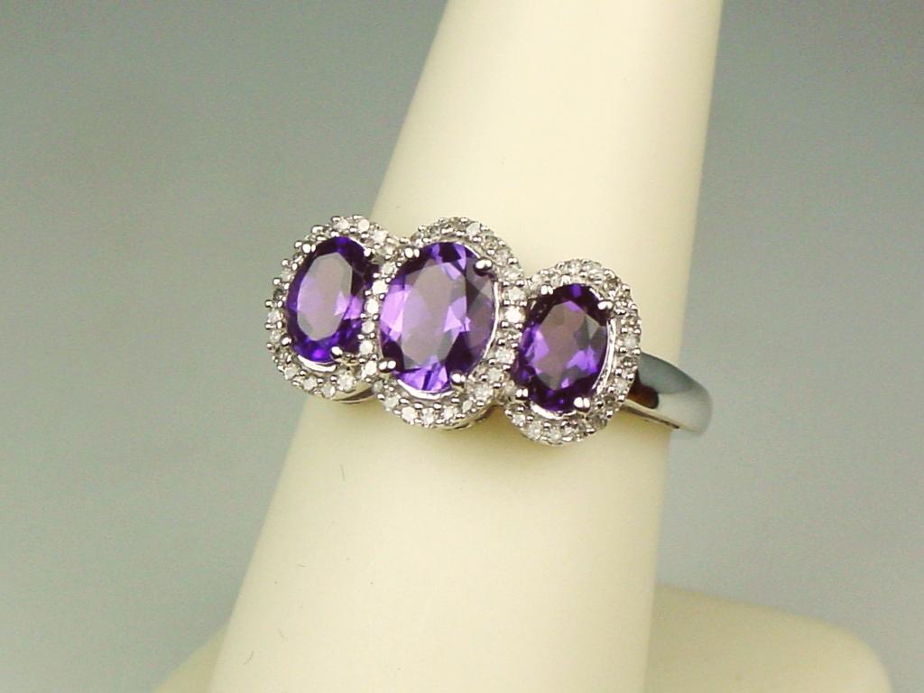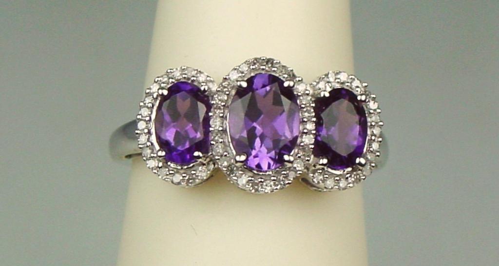 Dazzling 10 karat white gold ladies designer ring set with three matching oval Amethyst weighing approx. 2.00 carats and surrounded by over 56 round diamonds weighing approx. 0.50 carats of I-J colors and SI/I clarity.Retail $1,750.00 Estimate $500-$1,000