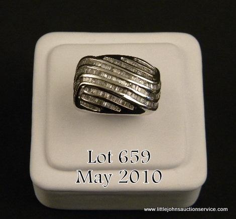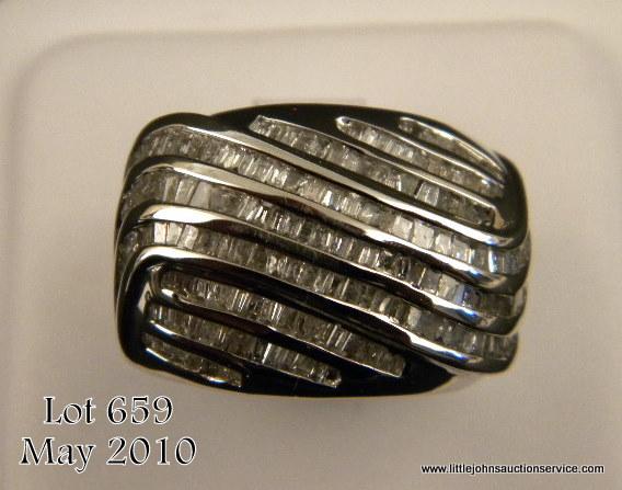 Dazzling 10 karat white gold ladies ring channel set with over 235 baguette cut diamonds weighing between 3.00-4.00 carats of G-H colors and I clarity. Retail $4,950.00 Estimate $1,000-$1,500