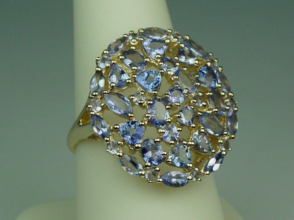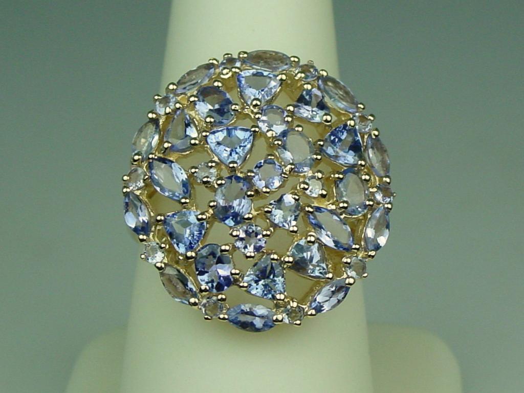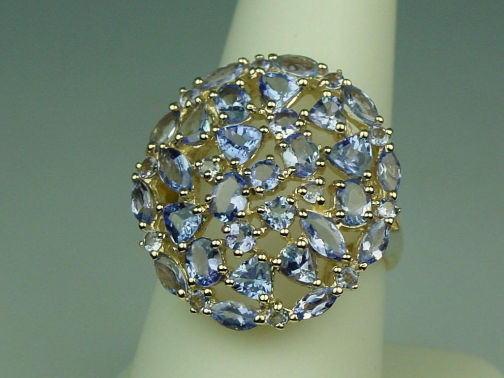 Dazzling 10 karat yellow gold ladies large  round cluster design ring set with  multi-shaped Tanzanites weighing approx. 4.00  carats. Retail $1,950.00 Estimate  $500-$1,000