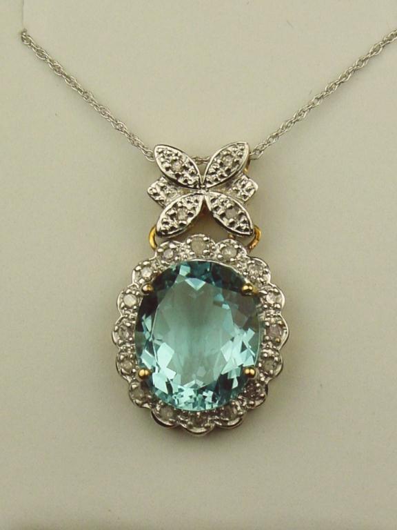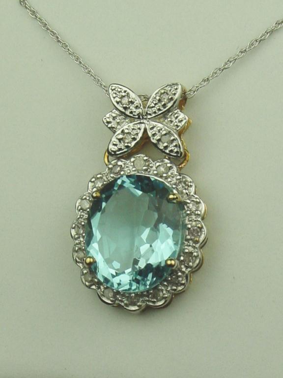 Dazzling 10K -2 Tone Gold Ladies Pendant Set with a large Sky blue topaz weighing approx. 6.00 carats and pave set with 20 round diamonds weighing approx 0.20 carats of H-I colors and SI clarity. Retail: $1,650.00Set with a large Sky blue topaz weighing approx. 6.00 carats and pave set with 20 round diamonds weighing approx 0.20 carats of H-I colors and SI clarity. Retail: $1,650.00
