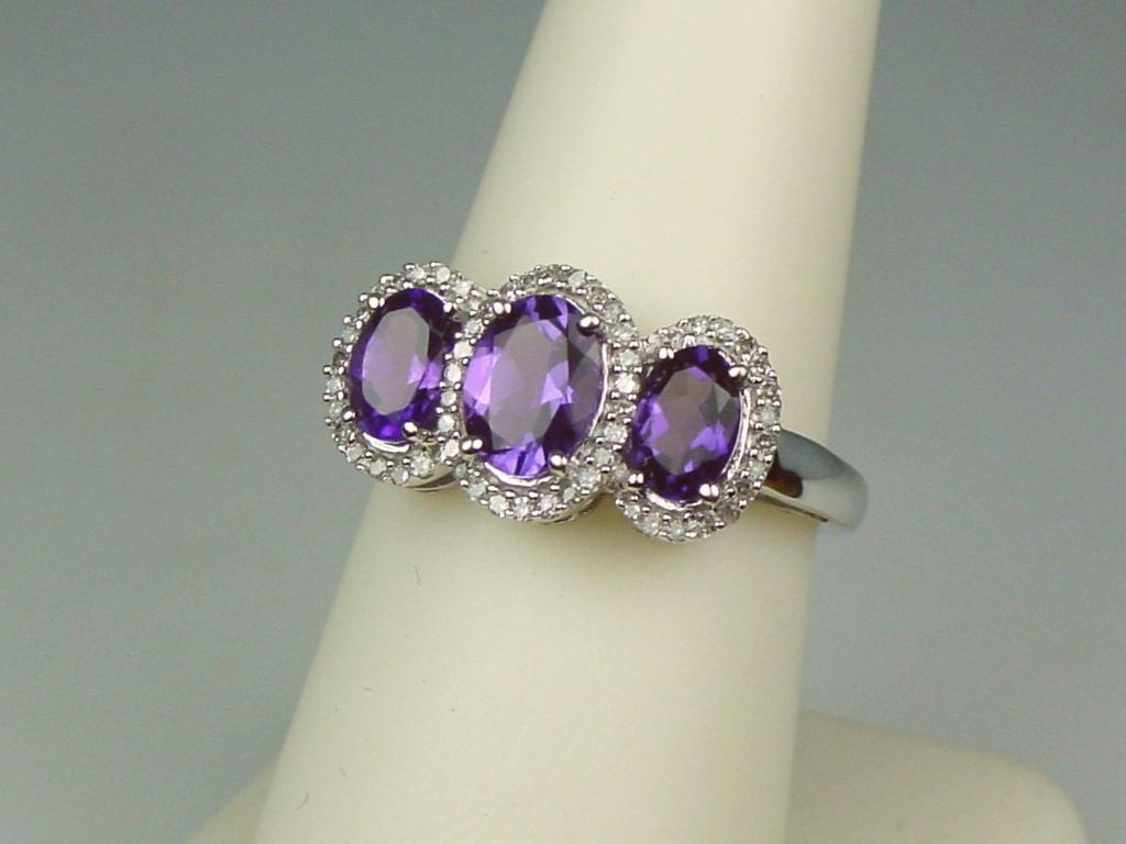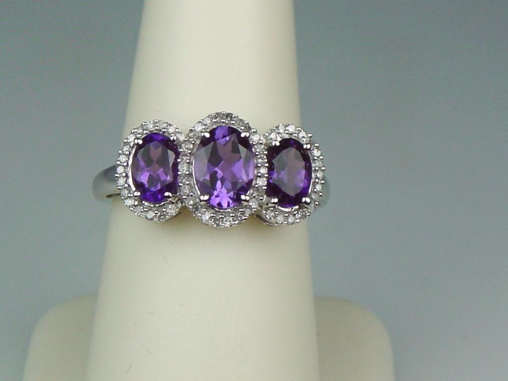 Dazzling 10K White Gold Ladies Ring Fine set with 3 matching oval Amethyst weighing approx. 2.00 carats and surrounded by over 56 round diamonds weighing approx. 0.50 carats of H-I colors and SI clarity. Retail: $1,950.00Fine set with 3 matching oval Amethyst weighing approx. 2.00 carats and surrounded by over 56 round diamonds weighing approx. 0.50 carats of H-I colors and SI clarity. Retail: $1,950.00