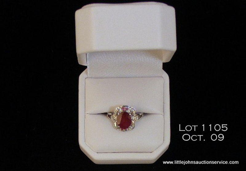 Dazzling 10karat white gold ladies ring set with a center oval red ruby weighing approx. 2.50 carats and side ruby and diamonds. Retail $1,650.00 Estimate $300-$500