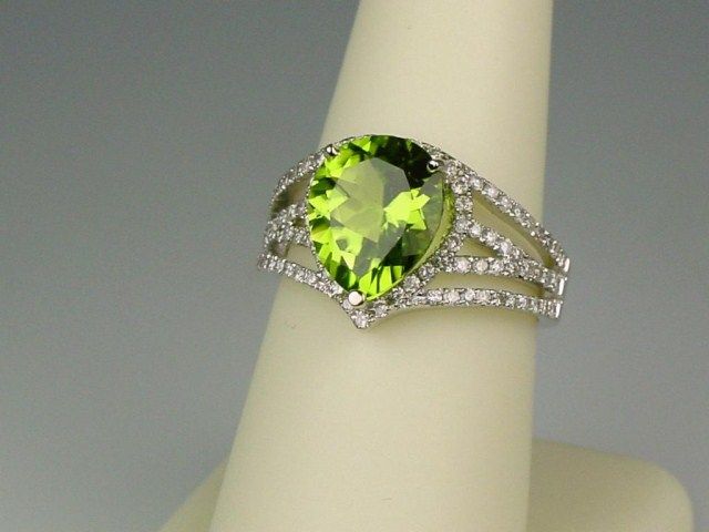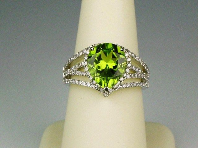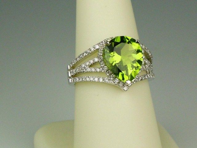 Dazzling 14 karat white gold ladies designer ring set with a fine Peridot weighing approx. 6.00 carats and micro set with 86 round brilliant cut diamonds weighing approx. 1.20 carats of G-H colors and mostly SI clarity.Retail $3,000-$3,500 Estimate $2,000-$2,500 Labor intensive
