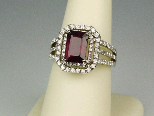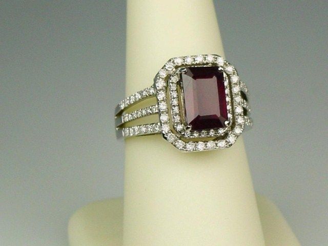 Dazzling 14 karat white gold ladies ring set with an emerald cut Red Ruby weighing 2.84 carats and micro set with 90 round brilliant cut diamonds weighing approx. 1.50-2.00 carats of F-G colors and SI clarity. Retail$4,000-$6,000 Estimate $2,000-$3,000 Labor intensive.